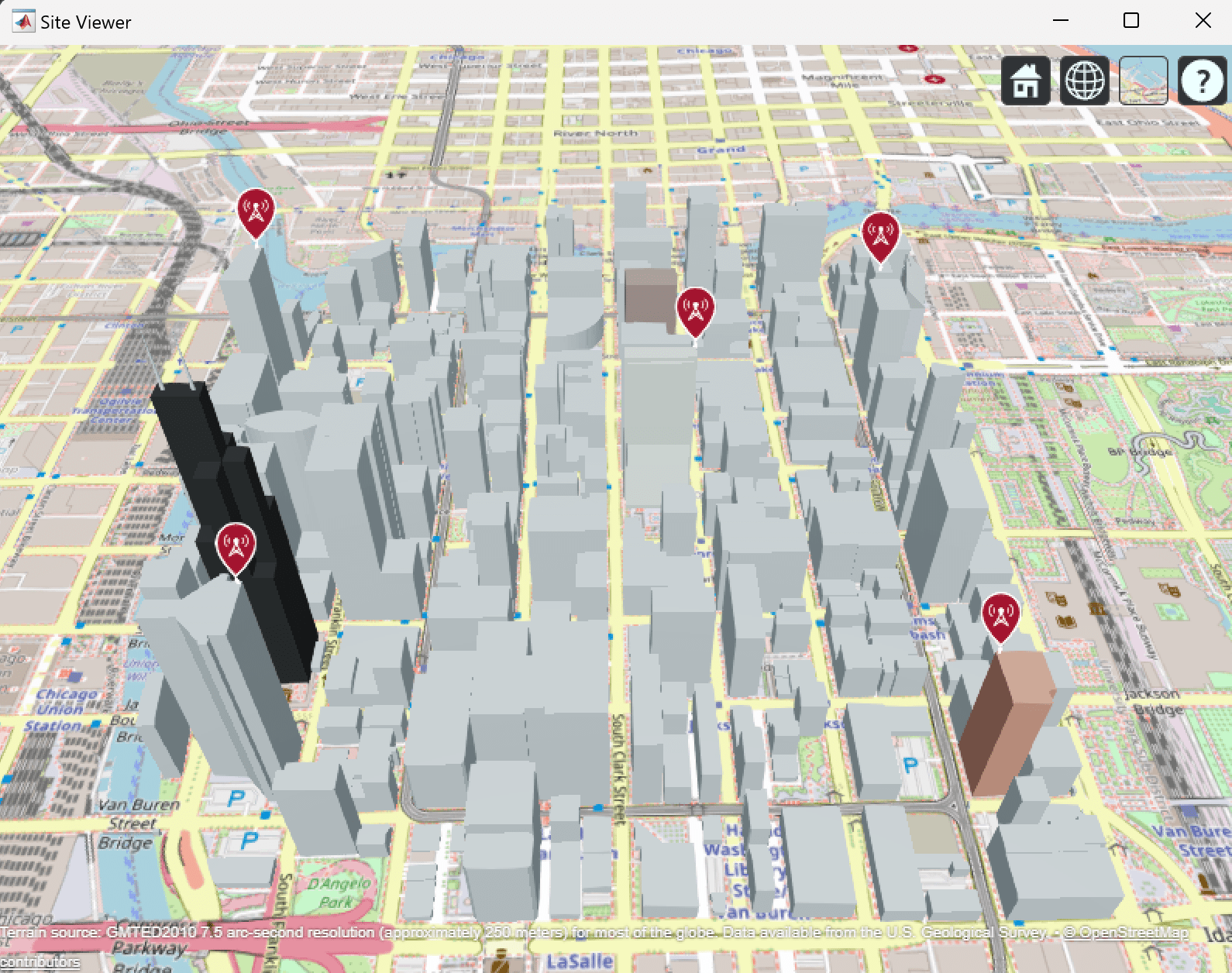 interfBS = [41.884085,-87.637310; 41.885208,-87.625557; 41.877766,-87.635363; 41.877684,-87.625858]; txInterf = txsite(Latitude=interfBS(:,1),Longitude=interfBS(:,2), ... TransmitterFrequency=fc, ... TransmitterPower=dBm2W(PtxInterfdBm)); show(txInterf)