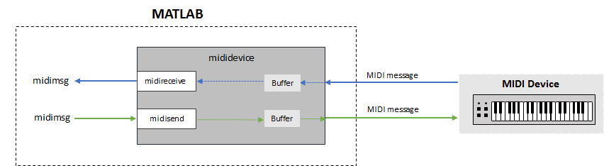 Create a MIDI message in MATLAB® using midimsg. Create a MIDI device interface using mididevice.