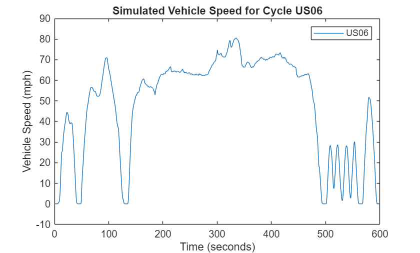 The FTP-75 drive cycle is available in the Drive Cycle Source block by default. To install the additional drive cycles, see Install Drive Cycle Data.