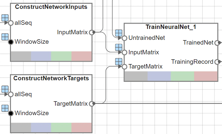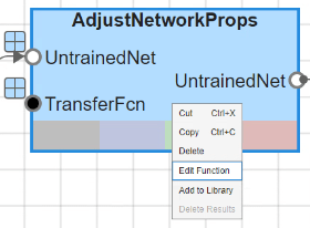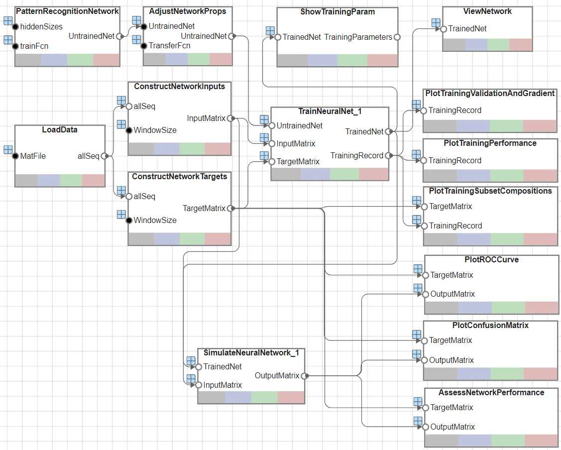 The UserFunction block named TrainNeuralNet leverages the built-in train function to train the neural network on the input data. The input port Net is the patternnet created earlier by the block PatternRecognitionNetwork, after the transfer function has been defined in AdjustNetworkProps.