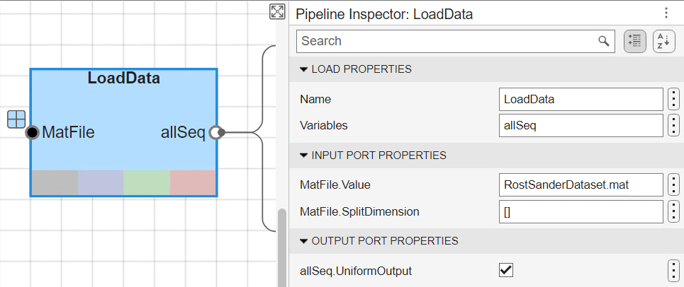 The block LoadData loads the data and specifically extracts the variable allSeq from the RostSanderDataset.mat file. This block is a built-in Load Block, and you can customize the block properties in the Pipeline Inspector pane.