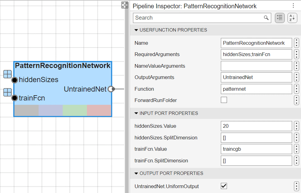 The pattern recognition network uses the default scaled conjugate gradient algorithm for training, but other algorithms are available in Deep Learning Toolbox. You can modify the training function by adjusting the property value for the trainFcn input port seen in the Pipeline Inspector pane of the PatternRecognitionNetwork block.