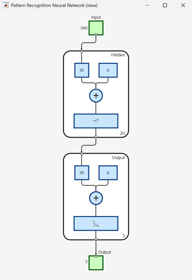 This block uses the built-in MATLAB function patternnet to build the neural network as defined in the Function property shown in the image above.
