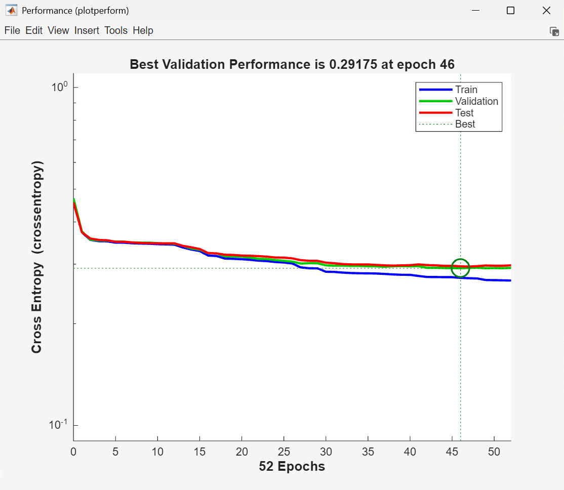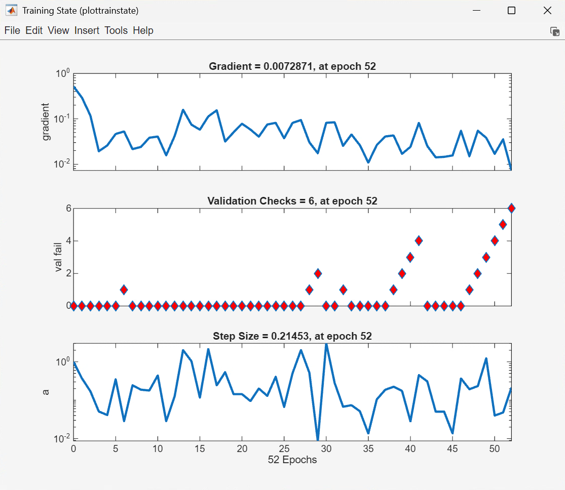 The training process stops when one of several conditions (see net.trainParam which can also be viewed within the AdjustNetworkProps block) is met. For example, in the training considered, the training process stops when the validation error increases for a specified number of iterations (6) or the maximum number of allowed iterations is reached (1000).
