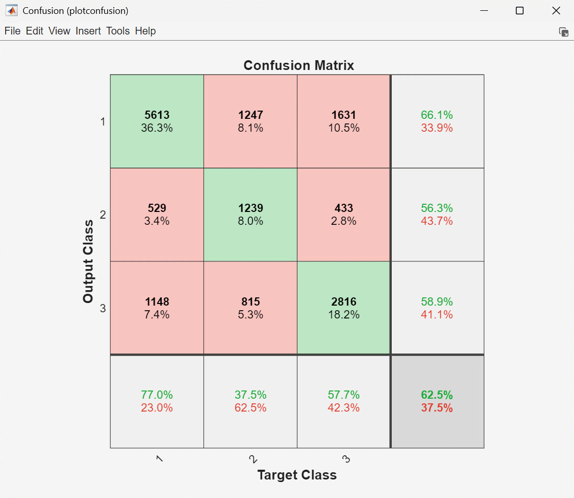 To analyze the network response, examine the confusion matrix by considering the outputs of the trained network and comparing them to the expected results (targets). The PlotConfusionMatrix block leverages the MATLAB function plotconfusion to generate the following figure.