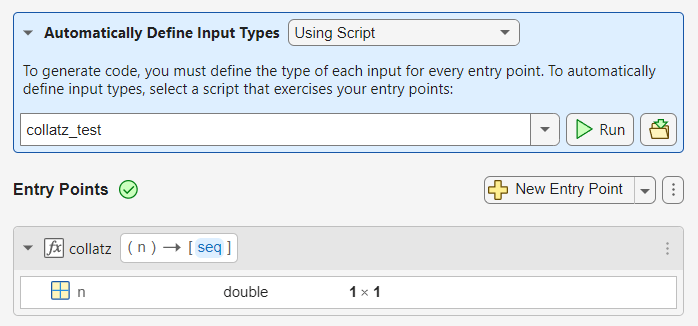 Set the Automatically Define Input Types parameter to Using Script and enter collatz_test as the test script. Click the Run button. The app runs the test script and defines the input argument n as a scalar double.