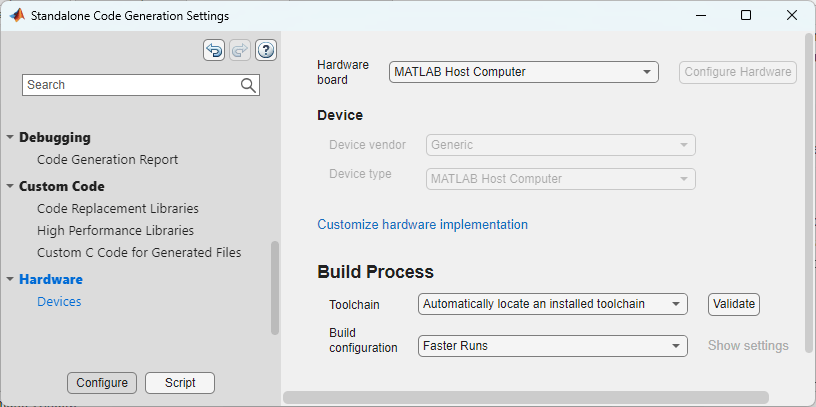 For this example, you verify the generated code by using SIL execution. On the MATLAB Coder tab, in the Prepare section, click Settings. The Standalone Code Generation Settings dialog box opens. In the left pane, click Hardware to open the hardware pane. To use SIL execution, set Hardware board to MATLAB Host Computer. To use PIL execution, set Hardware board to None — Select device. For this example, make sure that the Hardware board parameter is set to MATLAB Host Computer. Close the dialog box.