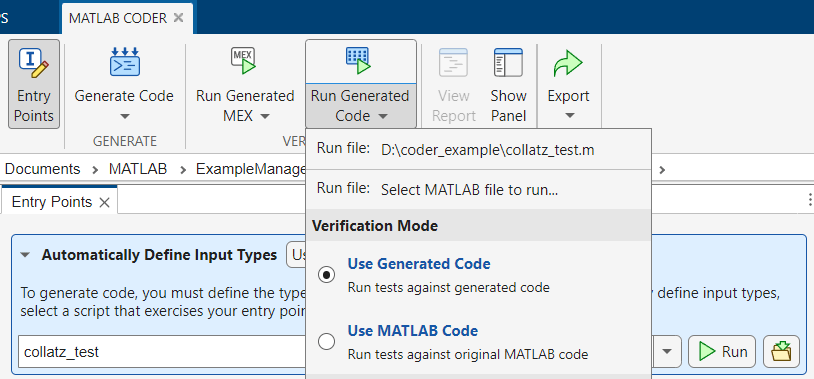 To verify the generated code, in the MATLAB Coder tab, in the Verify section, click Run Generated Code and make sure that Verification Mode is set to Use generated code. Then, select the test file: