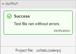 The code generator runs the generated code by using SIL. In this example, the app does not detect issues. The Output section of the MATLAB Coder panel displays a message indicating that the collatz_test file did not produce errors.