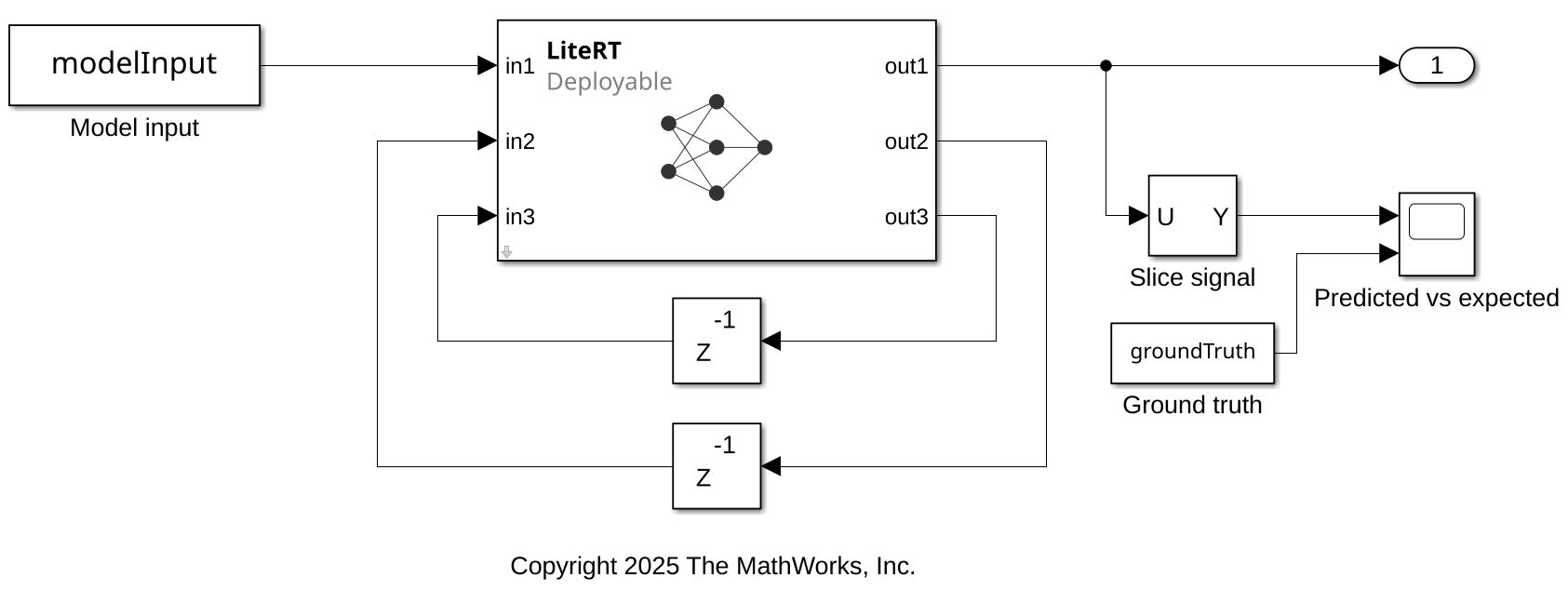 The bsocLiteRTModel model contains two From Workspace blocks that import the model input signal and the ground truth signal. The LiteRT block loads the LSTM network into Simulink®. The LiteRT block outputs the LSTM state outputs from outports out2 and out3 and passes them back to itself as initial states for the next time step by using a feedback loop with a one-step delay. The Scope block displays the model output and the ground truth signal.