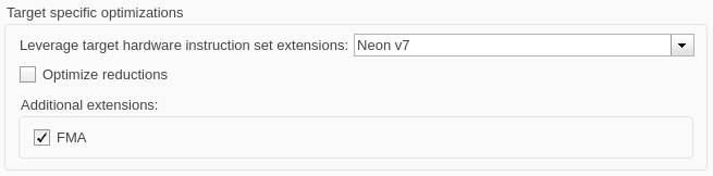 In the Code Generation > Optimization pane, in the Target specific optimizations section, set Leverage target hardware instruction set extensions to Neon v7. To use fast multiply-add to optimize the performance of generated code, select the FMA box. Click OK.