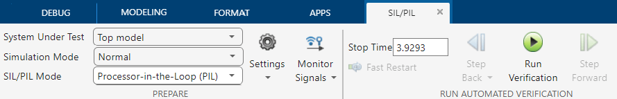 On the Apps tab, click SIL/PIL Manager. In the SIL/PIL tab, in the Mode section, set SIL/PIL Mode to Processor-in-the-Loop (PIL). Then click Run Verification.