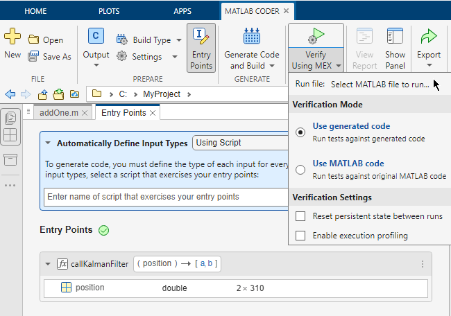 To run units tests on the MEX function, expand the Verify Using MEX button in the MATLAB Coder toolstrip. Make sure that Use Generated Code is selected. Click Run File: Select MATLAB file to run ... and select the test file run_unit_tests_kalman.m.