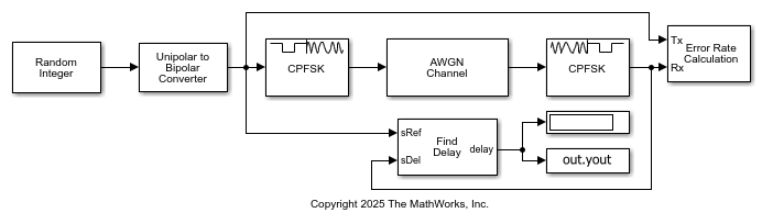 The CPFSK Modulator Baseband and CPFSK Demodulator Baseband blocks use continuous phase frequency shift keying (CFPSK) for modulation and demodulation.