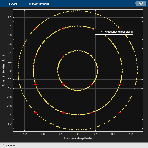 M = 16; % 16-QAM spf = 1e3; % Number of symbols per frame fs = 1e5; % Sample rate (Hz) fOffset = 50; % Frequency offset (Hz) refQAM = qammod(0:M-1,M,UnitAveragePower=true); cd = comm.ConstellationDiagram( ... ReferenceConstellation={refQAM}, ... ShowLegend=true, ... ChannelNames={'Frequency offset signal'});