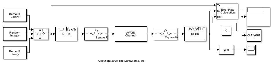 The cm_varsize_qpsk_ber.slx model generates frames of source data by using two Bernoulli Binary blocks. One Bernoulli Binary block outputs 2000 samples per frame and the other outputs 4000 samples per frame. The model uses a switch to randomly vary which Bernoulli Binary block supplies the frame of source data to transmit. The model plots the frame length variation and computes the BER for each input frame.