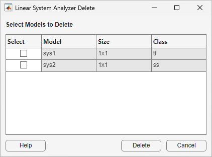 To remove models from Linear System Analyzer, select Edit > Delete Systems. The Linear System Analyzer Delete dialog box opens.