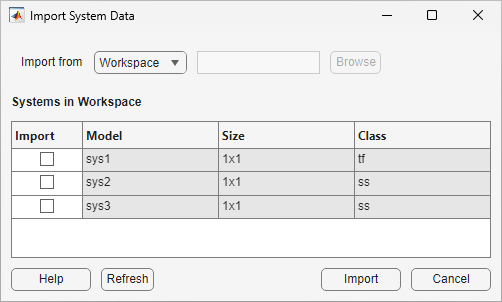 To import models into Linear System Analyzer, select File > Import. The Import System Data dialog box opens.