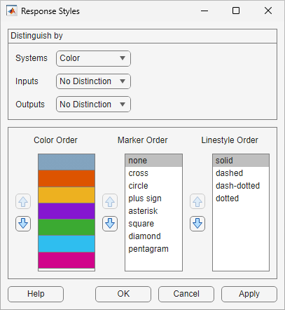Linear System Analyzer assigns response color, marker style, and line style based on the order specified under Color Order, Marker Order, and Linestyle Order, respectively.