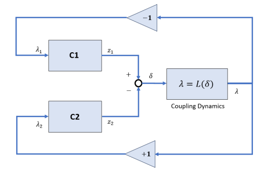 In general, you can represent physical couplings in a block diagram form as shown in the following figure. The coupling is characterized by the "Coupling Dynamics" block mapping δ = z1 − z2 (collocation gap) to the internal forces λ. Here, z1 and z2 denote the positions on each part of the nodes being coupled together.