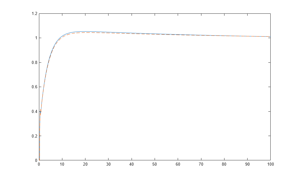 Compute the step response using a discrete time vector with Ts = 0.01. The response computed by step does not match the Simulink result. This mismatch indicates that the sample time is too large to capture the fast dynamics introduced by the internal delay.