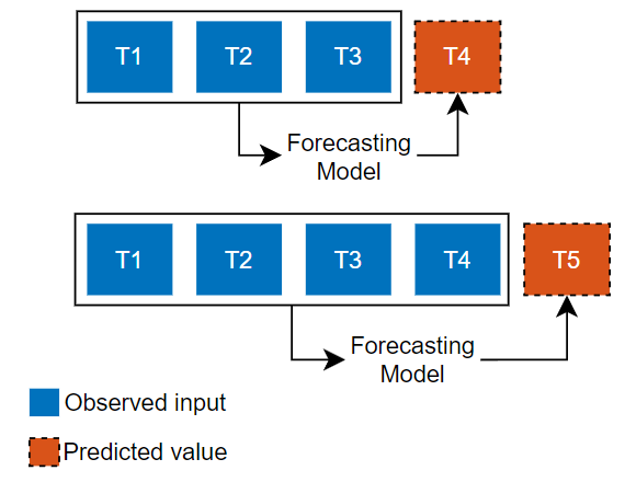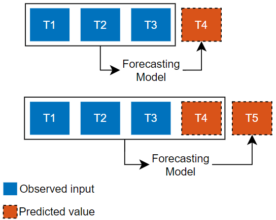Predict the next time step in a sequence using only the input data. When making predictions for subsequent time steps, you collect the true values from your data source and use those as input. Use this type of prediction when you have true values to provide to the model before making the next prediction. For example, use this option if you want to predict the next day's temperature, where each day you can record the true temperature value and use it as input to your model. | Predict subsequent time steps in a sequence by using the previous predictions as input. In this case, the model does not require the true values to make the prediction. Use this type of prediction to predict multiple subsequent time steps or when you do not have the true values to provide to the RNN before making the next prediction. For example, use this option if you have a virtual sensor and do not have access to live values to use as input to your model at each time step. |