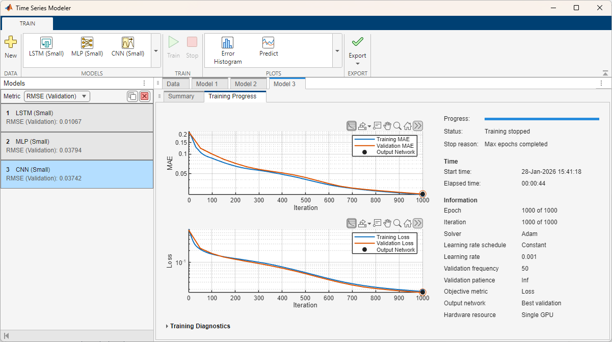 After training is complete, the Summary tab displays information about the RMSE and the MAE on the validation set. In this example, the LSTM model has the lowest error of the three models. The MLP and CNN models have similar RMSE and MAE values to one another.