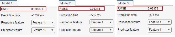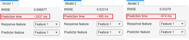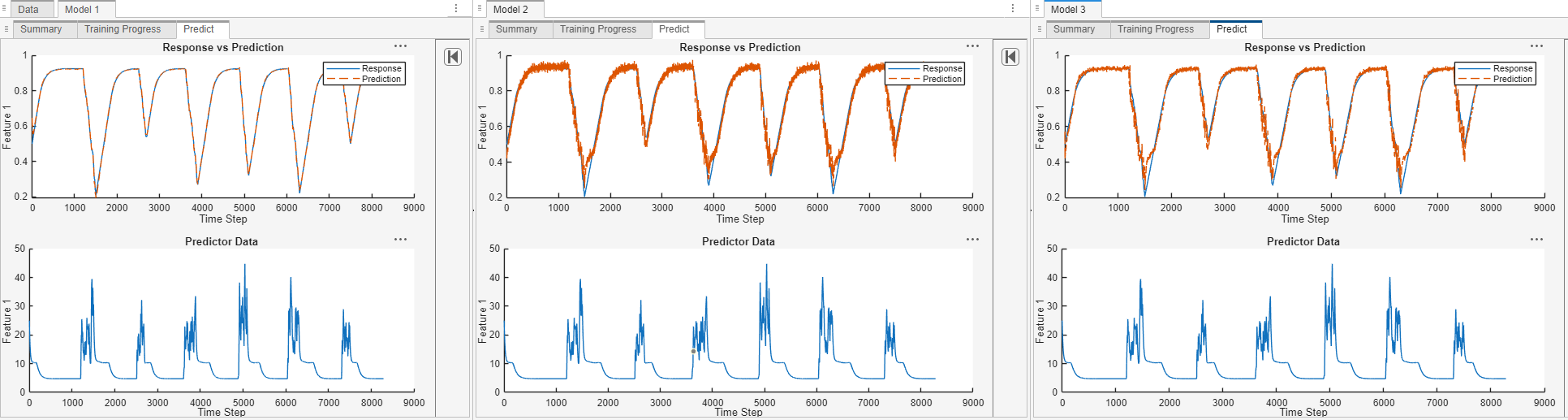For each model, click Predict. The Predict tab opens and displays the predictions of the model for each observation. Compare the predictions of each model on the first observation. You can compare the predictions side-by-side by dragging the Predict windows.