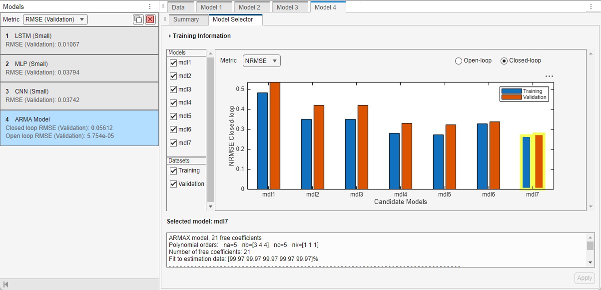After training, a plot displaying a set of candidate models and their respective NRMSE values appears on the Model Selector tab. At the top of the plot, in the Metric menu, you can choose other quality metrics that you want the plot to display. The available quality metrics are RMSE, NRMSE, MAE, AIC, and BIC. If you select Metric as RMSE, NRMSE, or MAE, you can select Open-loop or Closed-loop at the top right of the plot to display the respective plots. Selecting Open-loop is equivalent to specifying the prediction horizon input argument for the predict (System Identification Toolbox) command as 1, that is, performing a one-step-ahead prediction of the ARMA model. Selecting Closed-loop is equivalent to specifying the prediction horizon input argument for the predict (System Identification Toolbox) command as Inf, that is, performing a simulation of the ARMA model.