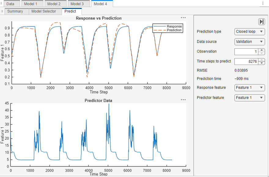To predict values for the training and validation data using the selected model, on the Train tab, click Predict. Set the Prediction type, Data source, Response feature, and Predictor feature to view the corresponding response vs prediction plots. For this example, set the Prediction type as Closed loop and Data source as Validation. You can see that the predictions of the trained model match the true values well.