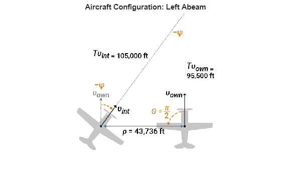 In each configuration, neither aircraft changes its course. Therefore, the angles and velocities theta, psi, vOwn, and vInt do not change with time. The relative distance rho, as well as the intruder ship coordinates xInt and yInt, do change with time. The acasXuConfiguration function returns the initial values of the time dependent variables.