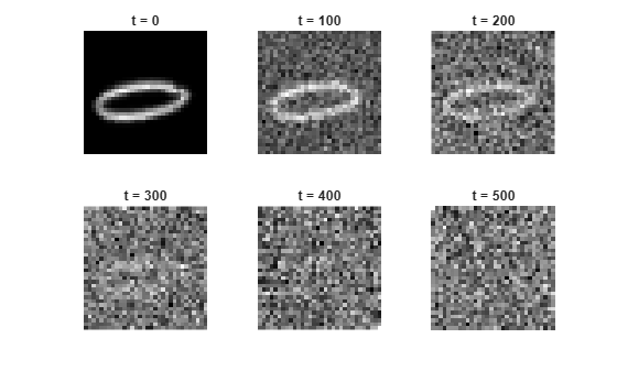 figure tiledlayout nexttile imshow(img,[]) title("t = 0"); for i = 1:5 nexttile noise = randn(size(img),like=img); noiseStepsToApply = numNoiseSteps/5 * i; noisyImg = applyNoiseToImage(img,noise,noiseStepsToApply,varianceSchedule); % Extract the data from the dlarray. noisyImg = extractdata(noisyImg); imshow(noisyImg,[]) title("t = " + noiseStepsToApply); end