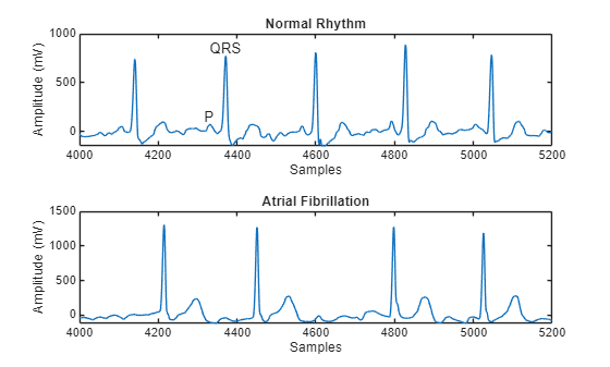 This example uses ECG data from the PhysioNet 2017 Challenge [1], [2], [3], which is available at https://physionet.org/challenge/2017/. The data consists of a set of ECG signals sampled at 300 Hz and divided by a group of experts into four different classes: Normal (N), Atrial Fibrillation (A), Other Rhythm (O), and Noisy Recording (~). In this example, use only the Normal and Atrial Fibrillation classes.