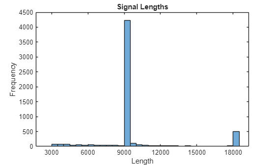 figure h = histogram(L); xticks(0:3000:18000) xticklabels(0:3000:18000) title("Signal Lengths") xlabel("Length") ylabel("Frequency")