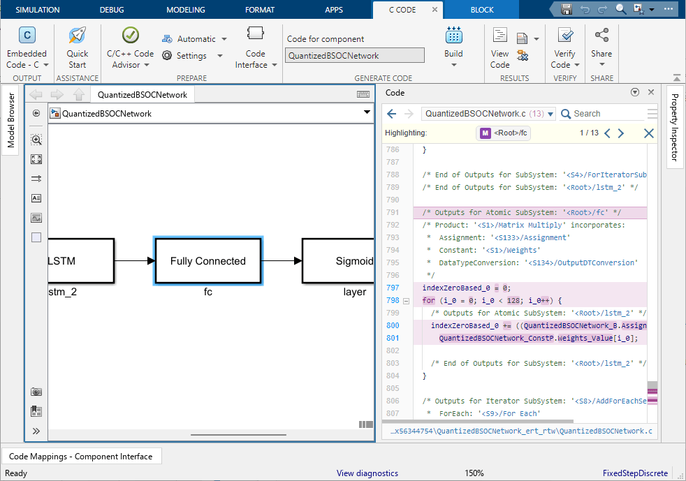 5. In the generated code in the Code view window, you see the first instance of highlighted code that is generated for the layer block. At the top of the Code view, numbers that appear to the right of generated file names indicate the total number of highlighted lines in each file. This figure shows the result of tracing the Fully Connected Layer block in the QuantizedBSOCNetwork model.