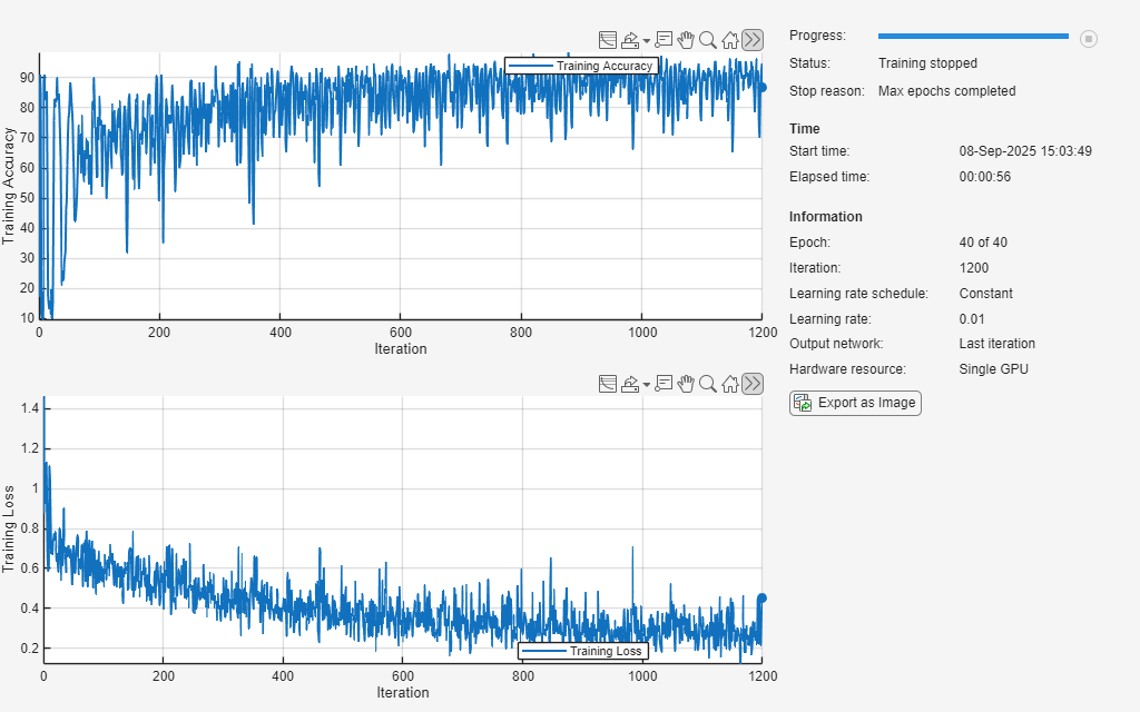 options = trainingOptions("adam", ... MaxEpochs=40, ... MiniBatchSize=128, ... InitialLearnRate=0.01, ... SequencePaddingDirection="left", ... Plots="training-progress", ... Metrics="accuracy", ... Verbose=false, ... InputDataFormats="CTB", ... Shuffle="every-epoch");