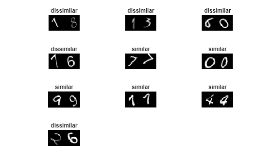 To train the network, the data must be grouped into pairs of images that are either similar or dissimilar. Here, similar images are defined as having the same label, while dissimilar images have different labels. The function getTwinBatch (defined in the Supporting Functions section of this example) creates randomized pairs of similar or dissimilar images, pairImage1 and pairImage2. The function also returns the label pairLabel, which identifies if the pair of images is similar or dissimilar to each other. Similar pairs of images have pairLabel = 1, while dissimilar pairs have pairLabel = 0.