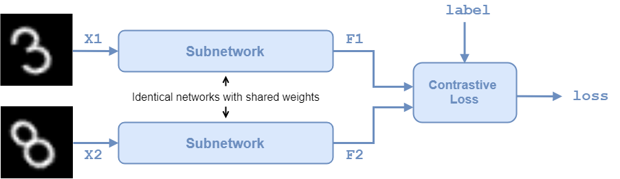 The function modelLoss takes the twin dlnetwork object net, a pair of mini-batch input data X1 and X2, and the label pairLabels. The function returns the contrastive loss between the reduced dimensionality features of the paired images and the gradients of the loss with respect to the learnable parameters in the network. Within this example, the function modelLoss is introduced in the section Define Model Loss Function.