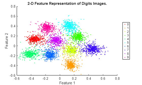 uniqueGroups = unique(TTest); colors = hsv(length(uniqueGroups)); figure hold on for k = 1:length(uniqueGroups) ind = TTest==uniqueGroups(k); plot(FTest(1,ind),FTest(2,ind),".",Color=colors(k,:)); end hold off xlabel("Feature 1") ylabel("Feature 2") title("2-D Feature Representation of Digits Images."); legend(uniqueGroups,Location="eastoutside");
