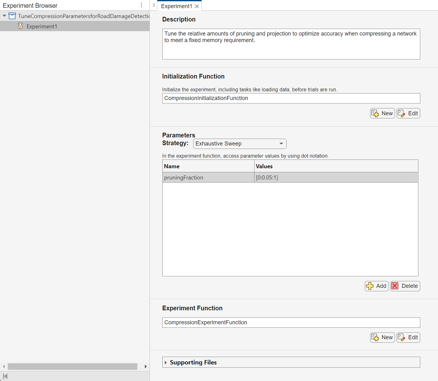 5. Add the supporting files — Copy the files countTotalParameters.m, loadAndPreprocessDataForRoadDamageDetectionExample.m, and RoadDamageAnalysisNetwork.mat, attached to this example as supporting files, to the project directory created by Experiment Manager. Experiment Manager automatically detects the supporting files in the project directory.