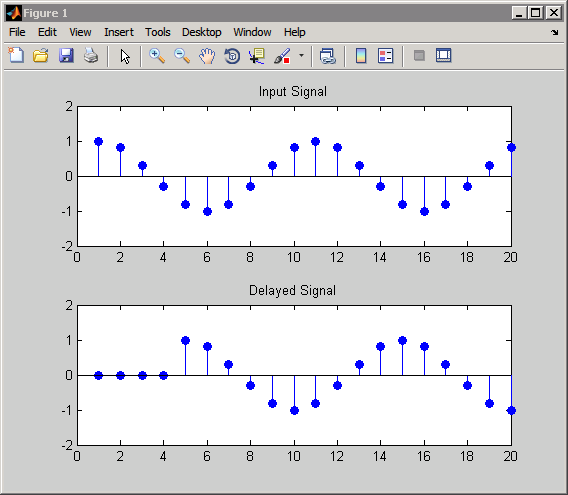 Hd = dfilt.delay returns a discrete-time filter, Hd, of type delay, which adds a single delay to any signal filtered with Hd. The filtered signal has its values shifted by one sample.