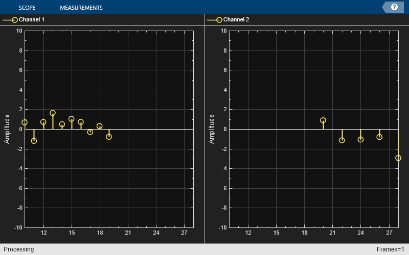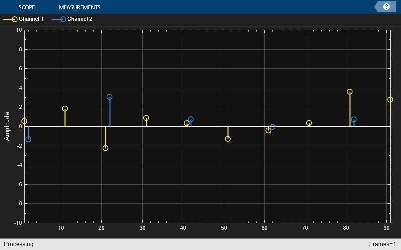 "Stem"– The scope displays the input signal as circles with vertical lines extending down to the x-axis at each of the sampled values."Line"– The scope displays the input signal as lines connecting each of the sampled values."Stairs"– The scope displays the input signal as a stair-step graph. A stair-step graph is made up of only horizontal lines and vertical lines. Each horizontal line represents the signal value for a discrete sample period and is connected to two vertical lines. Each vertical line represents a change in values occurring at a sample. Stair-step graphs are useful for drawing time history graphs of digitally sampled data."Bar"–– The scope displays the input signal with rectangular bars, where bar lengths are proportional to the signal values. (since R2024b)