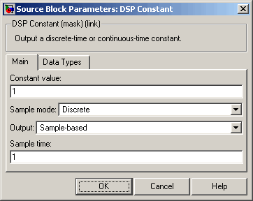 The DSP Constant block generates a signal whose value remains constant throughout the simulation. The Constant value parameter specifies the constant to output, and can be any valid MATLAB® expression that evaluates to a scalar, vector, or matrix.