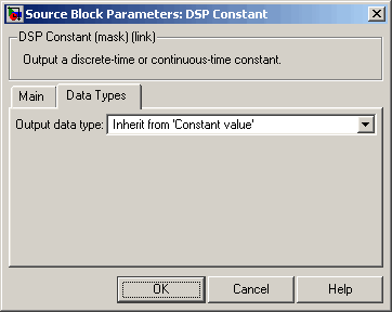 The Data Types pane of the DSP Constant block dialog box appears as follows.