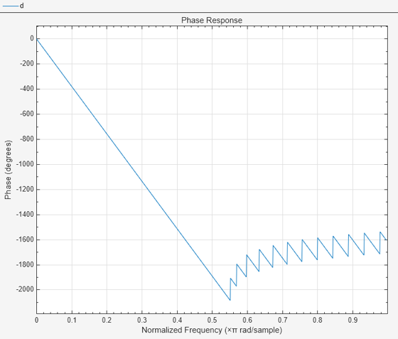 设计低通 FIR 滤波器,并在滤波器分析器中显示其相位响应。使用 1024 个 NFFT 点,并以度为单位显示相位。
