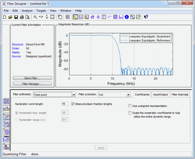 设置量化参数 - 提供对组成量化滤波器的量化器属性的访问。当您点击设置量化参数时,您会看到滤波器设计工具在对话框底部(设计区域)显示量化选项,如图中所示。