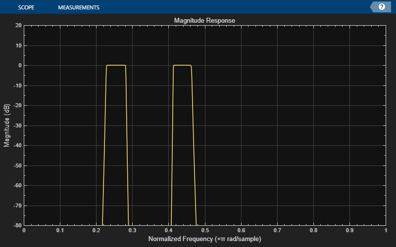 filterViz = dsp.DynamicFilterVisualizer(NormalizedFrequency=true,YLimits=[-80 20]);