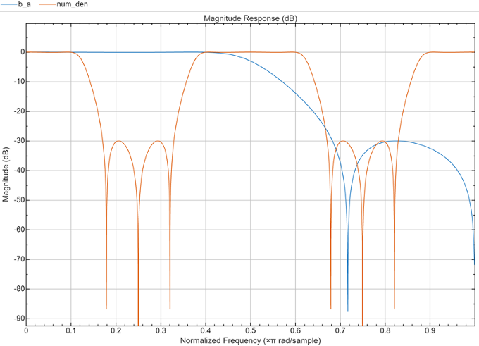 It also returns the numerator, AllpassNum, and the denominator, AllpassDen, of the allpass mapping filter. The prototype lowpass filter is given with a numerator specified by B and a denominator specified by A.