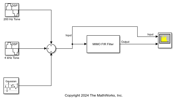 Open the multiPathMIMOFIRBlock.slx model. The input is a noisy sinusoidal signal with two tones, one at 200 Hz and the other at 4 kHz. The noise is a white Gaussian noise with a mean of 0 and a variance of 0.01. Pass this signal to the MIMO FIR Filter block.