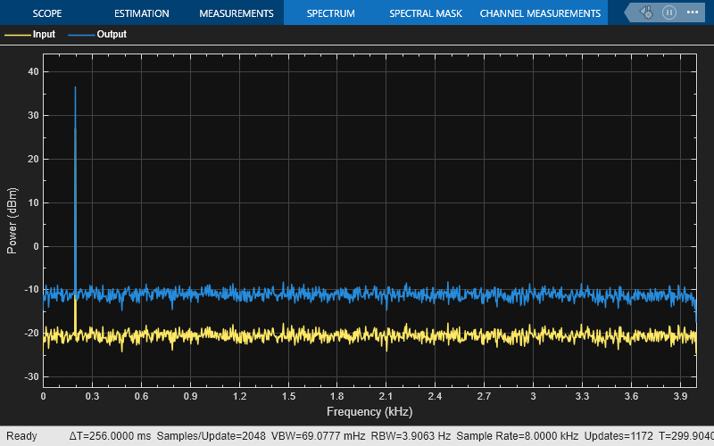Run the model and visualize the spectrum of the input and the filtered output signals in the spectrum analyzer.